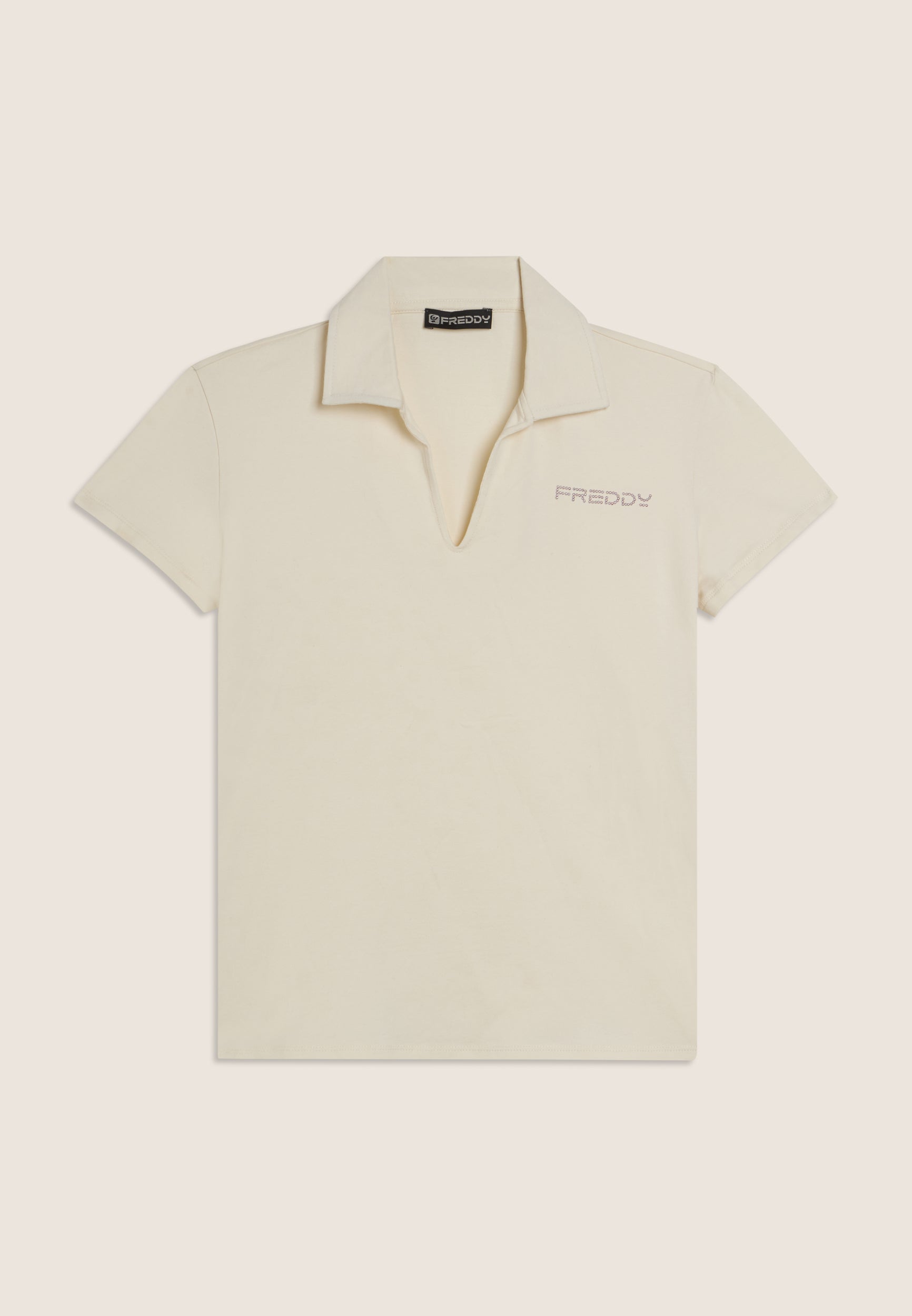 T-shirt manica corta dal design caratterizzato dallo scollo a V e collo a camicia che aggiunge un tocco sofisticato. La vestibilità regular e il fondo dritto la rendono perfetta per il tempo libero dinamico. Il logo FREDDY in perline rosa chiaro sul cuore e gli inserti elastici lucidi che decorano le cuciture laterali creano un dettaglio elegante. Realizzata in jersey leggero stretch di cotone, è ideale per un look comodo e versatile.