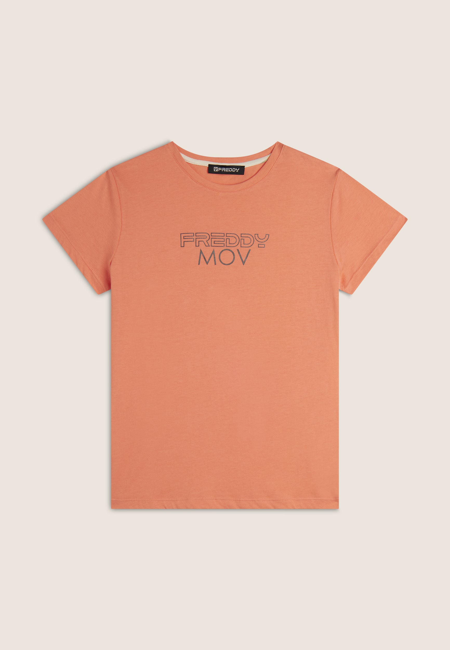 Perfetta per ogni momento della giornata, questa t-shirt regular fit in jersey leggero offre una lunghezza regular e un fondo dritto. Lo scollo girocollo e le maniche corte regular aggiungono praticità, mentre la grande stampa metallizzata FREDDY MOV al centro dona un dettaglio distintivo e luminoso.