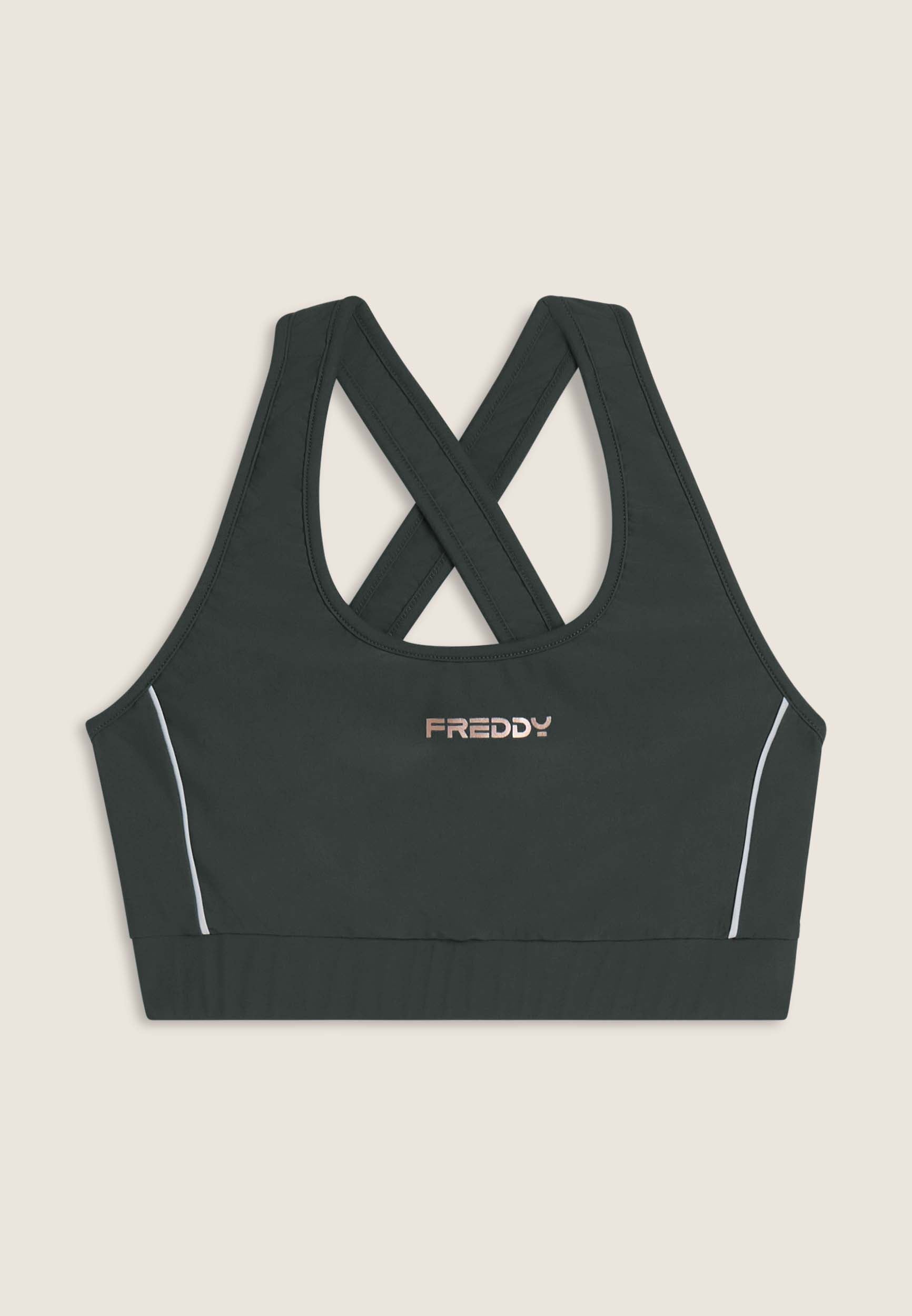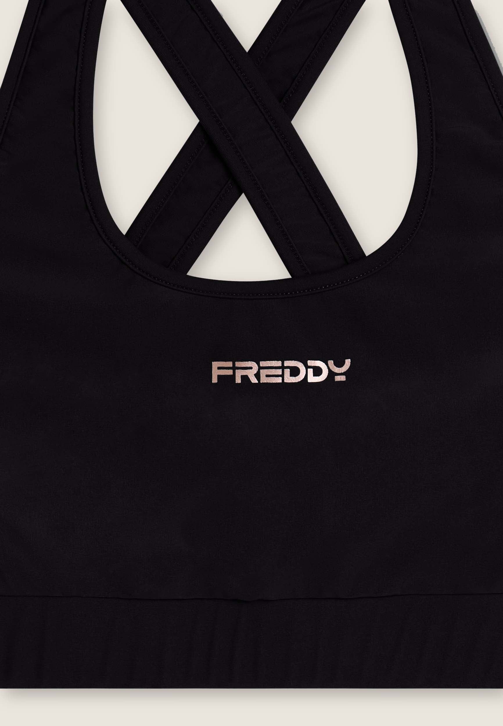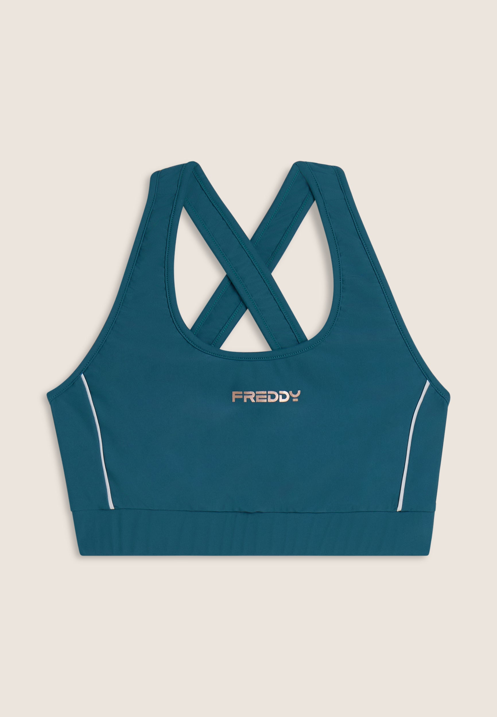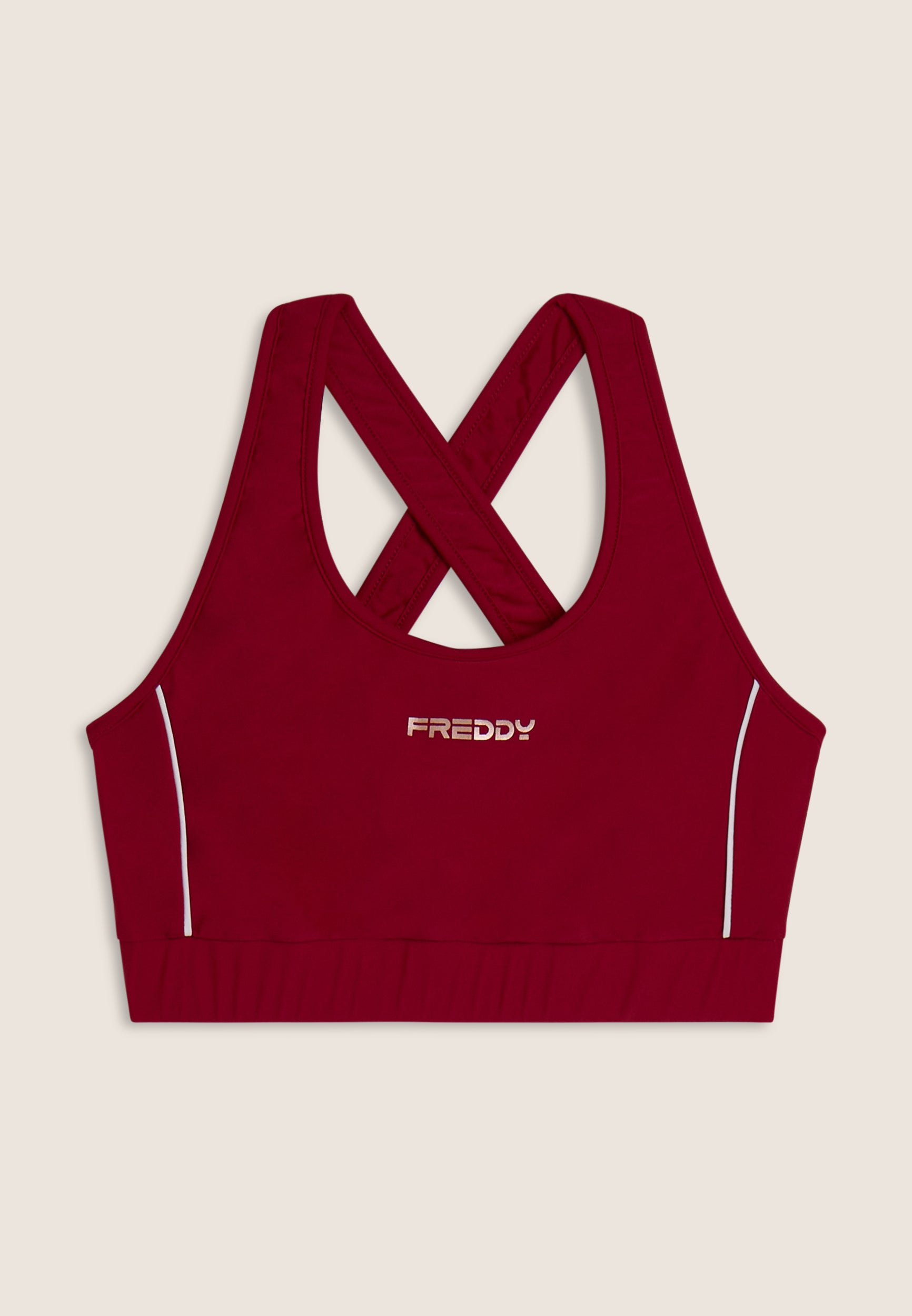 Pensato per sostenerti durante l’attività fisica, questo sport bra con scollo tondo e spalline incrociate sul retro unisce stile e funzionalità. Realizzato in morbido jersey nylon elasticizzato, è traspirante, leggero e resistente. I profili bianchi a contrasto e il logo FREDDY stampato sul fronte completano il design con dettagli grafici ben definiti.