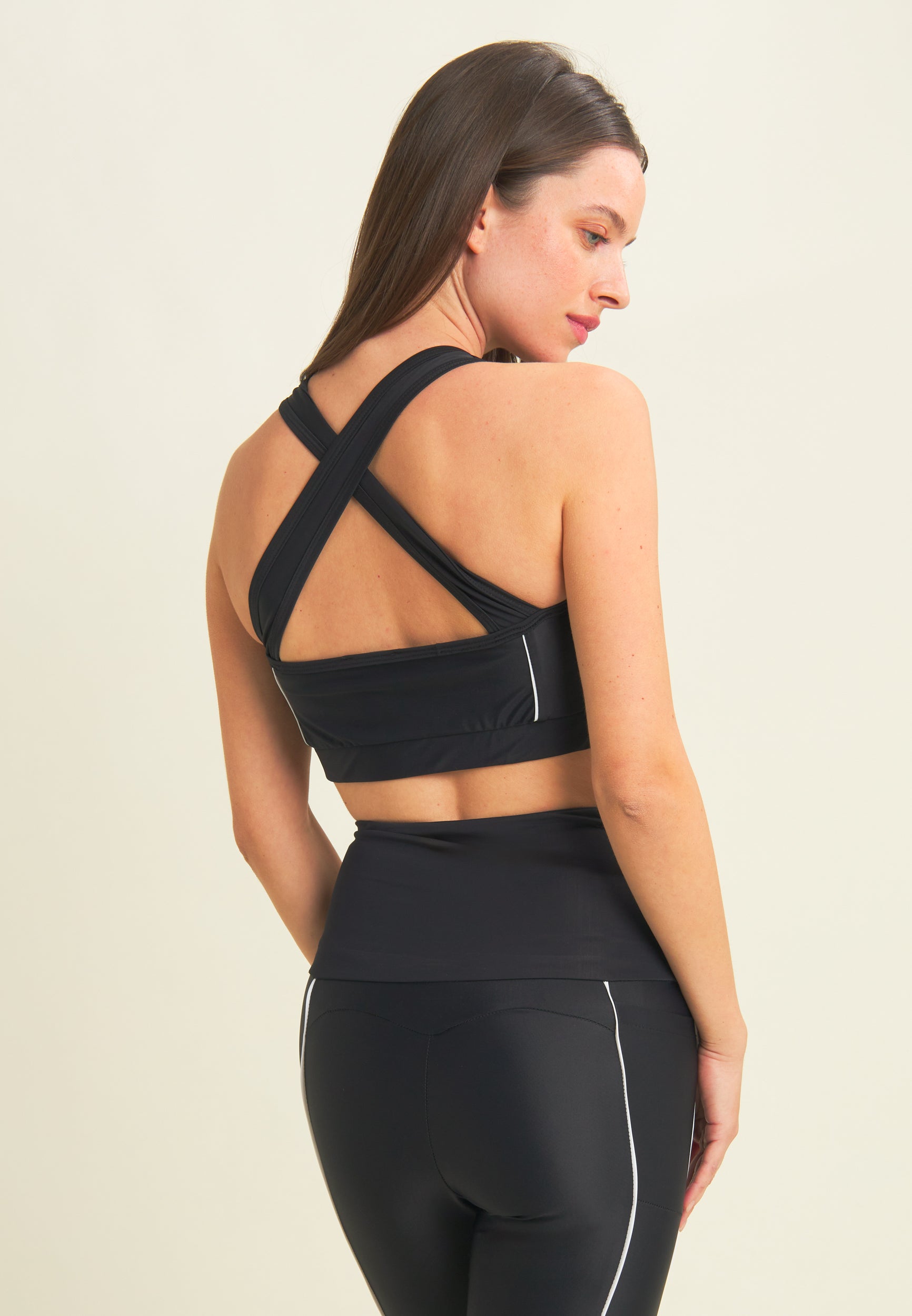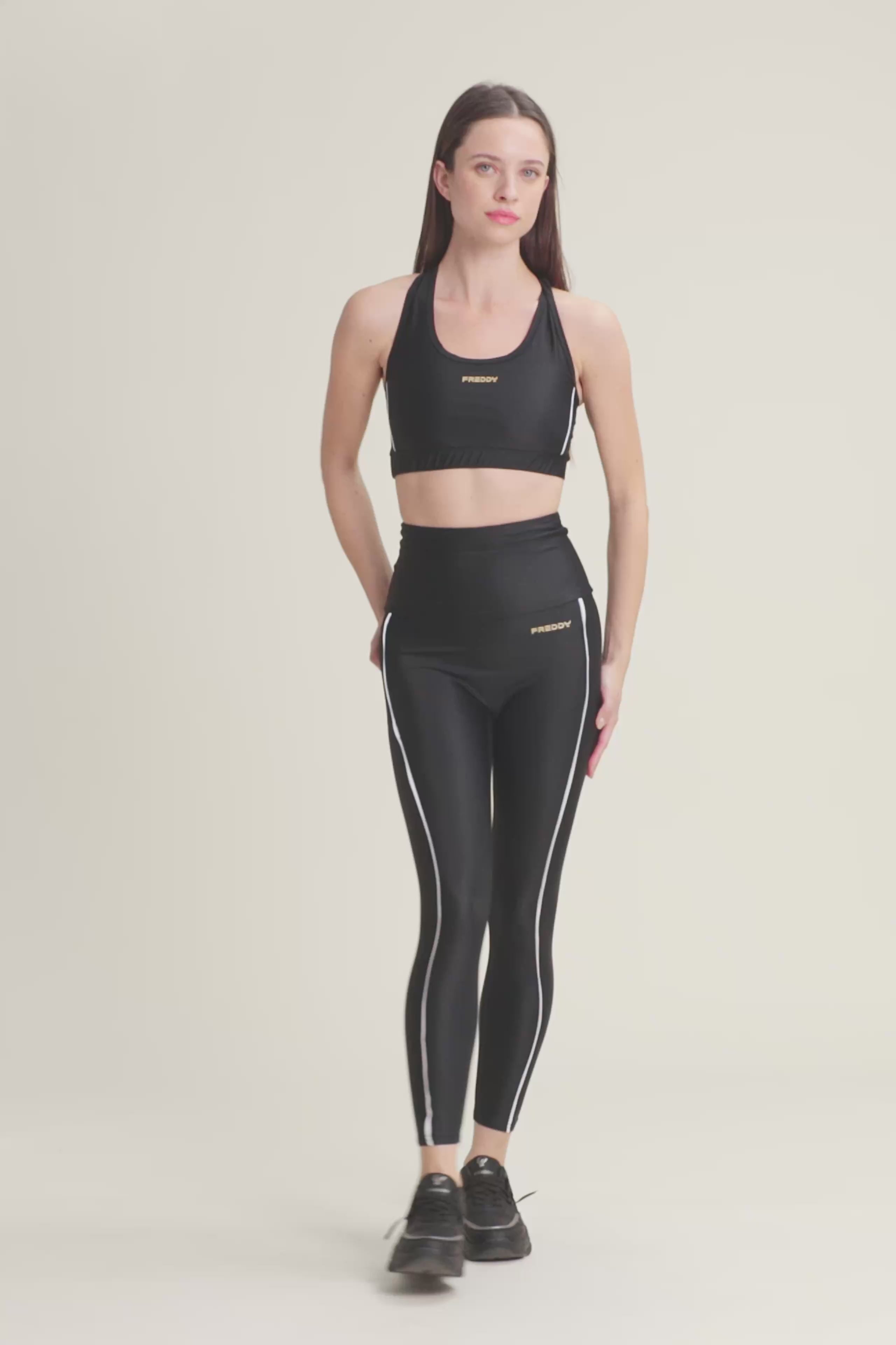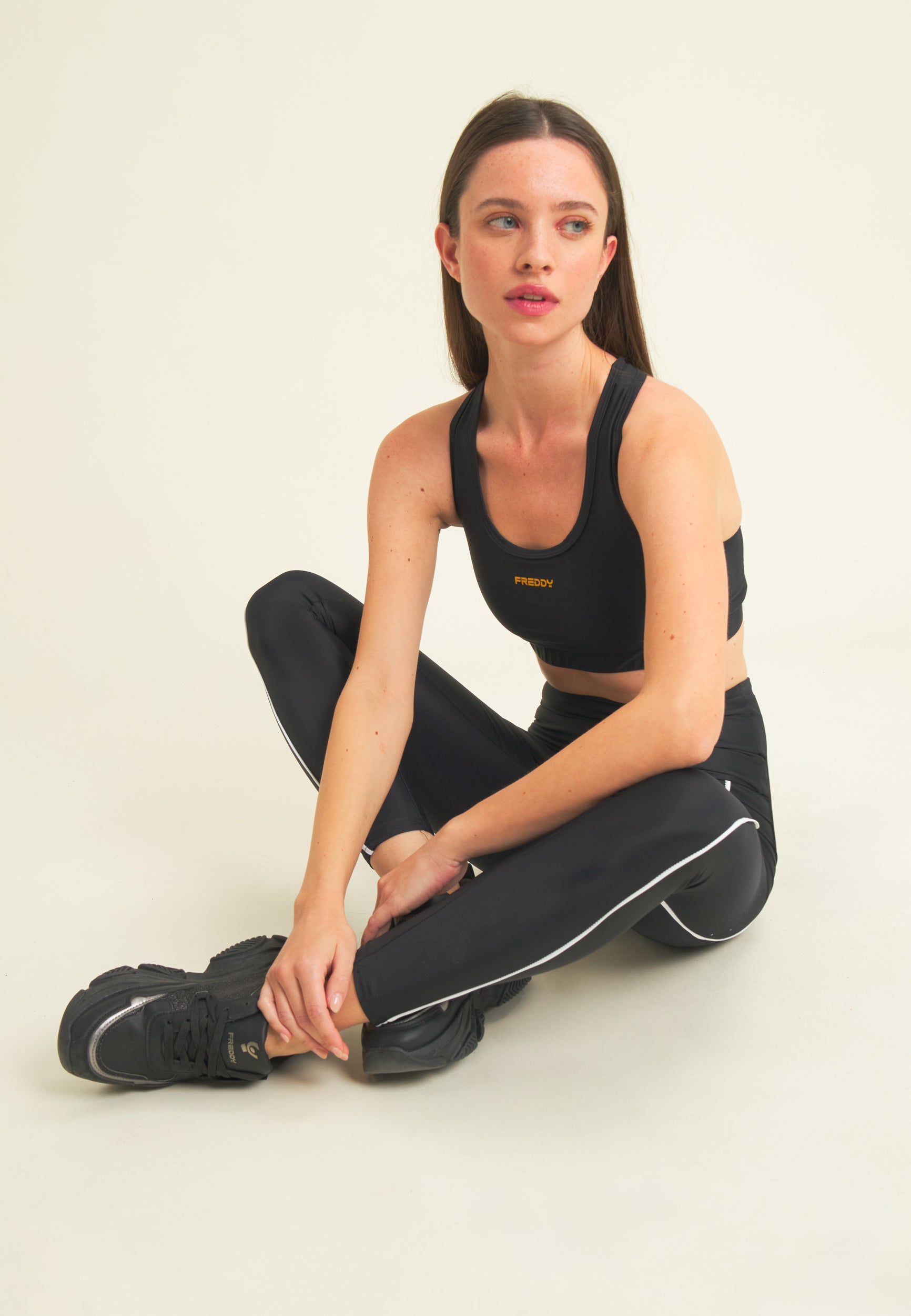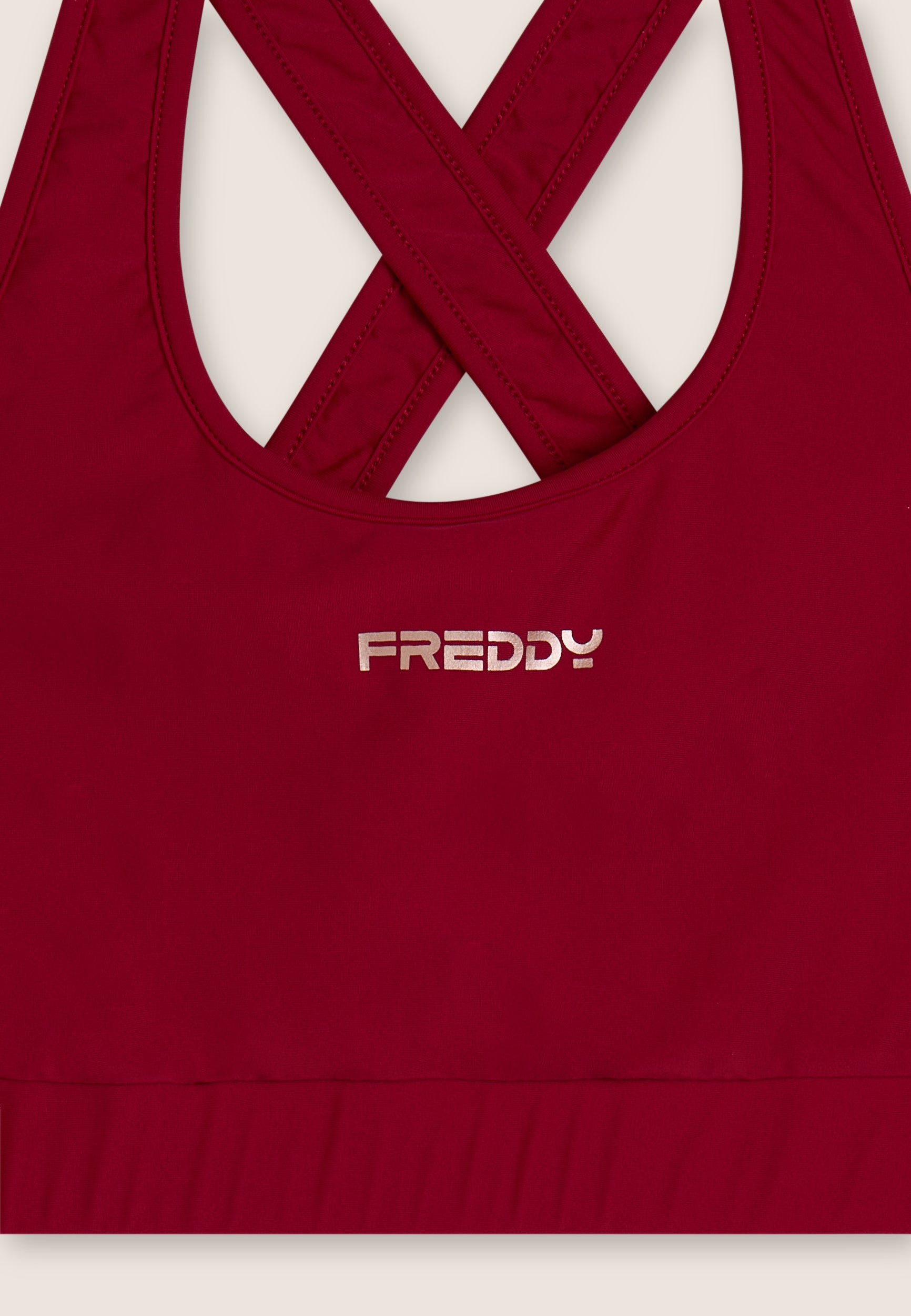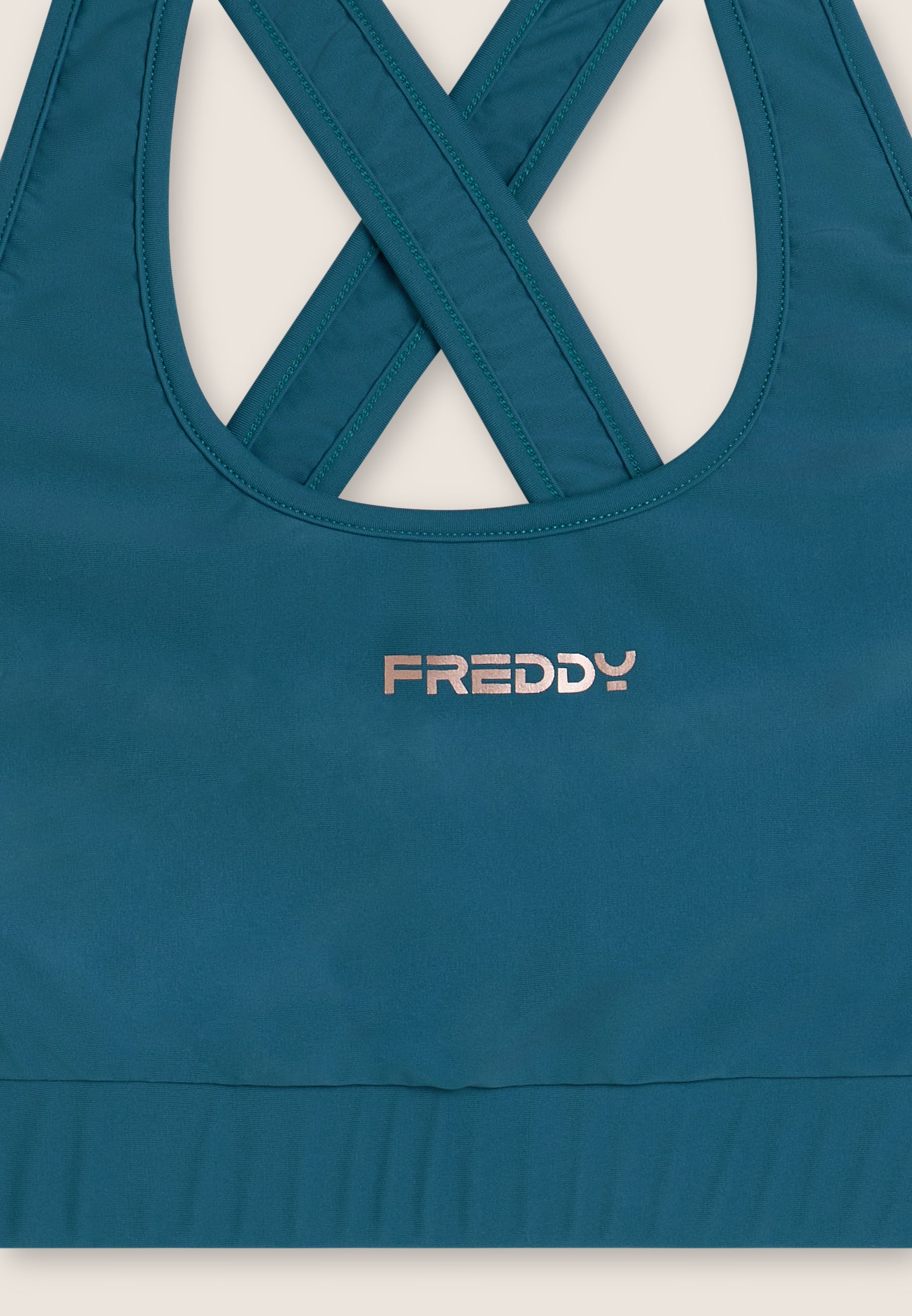Pensato per sostenerti durante l’attività fisica, questo sport bra con scollo tondo e spalline incrociate sul retro unisce stile e funzionalità. Realizzato in morbido jersey nylon elasticizzato, è traspirante, leggero e resistente. I profili bianchi a contrasto e il logo FREDDY stampato sul fronte completano il design con dettagli grafici ben definiti.