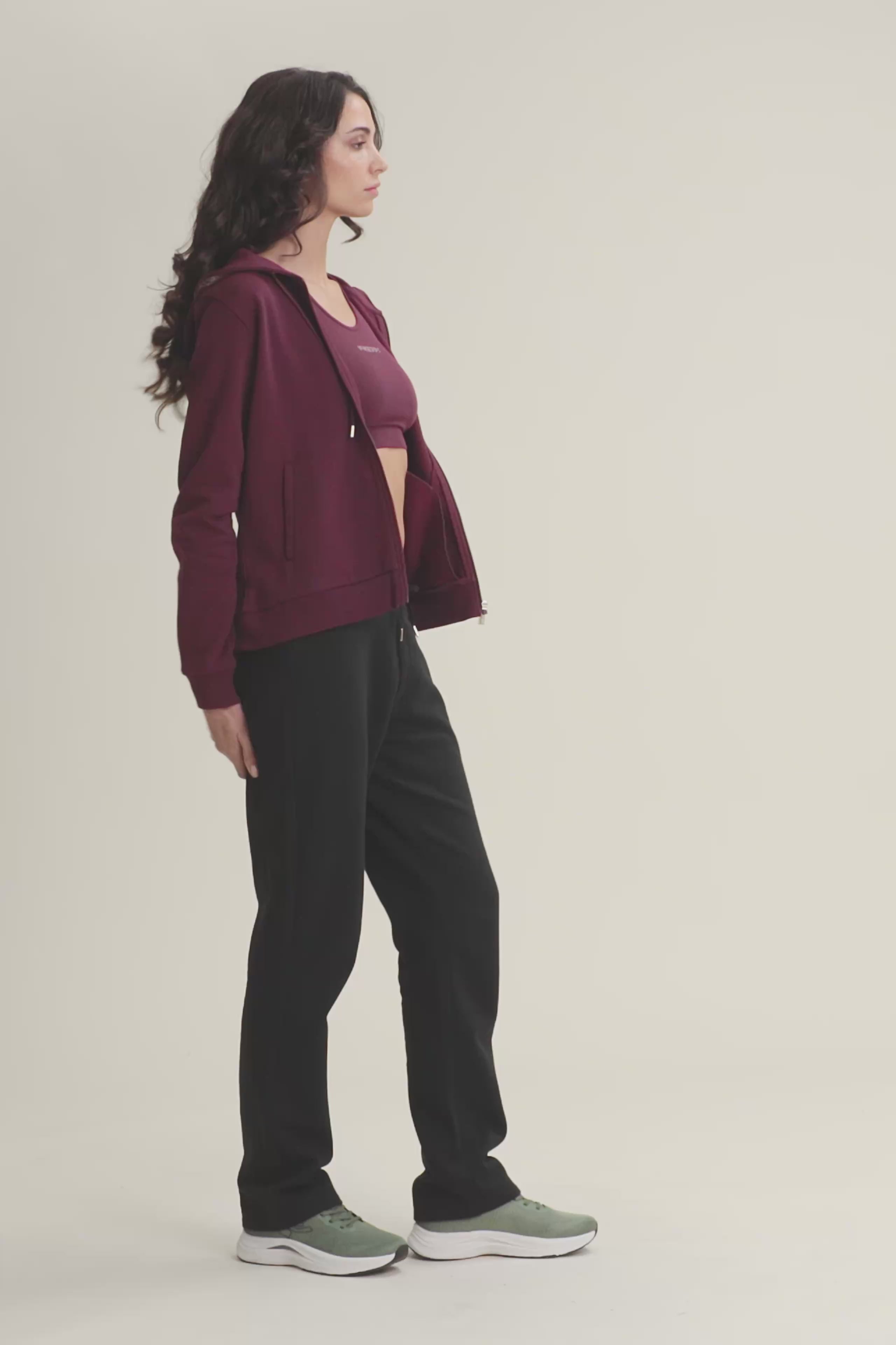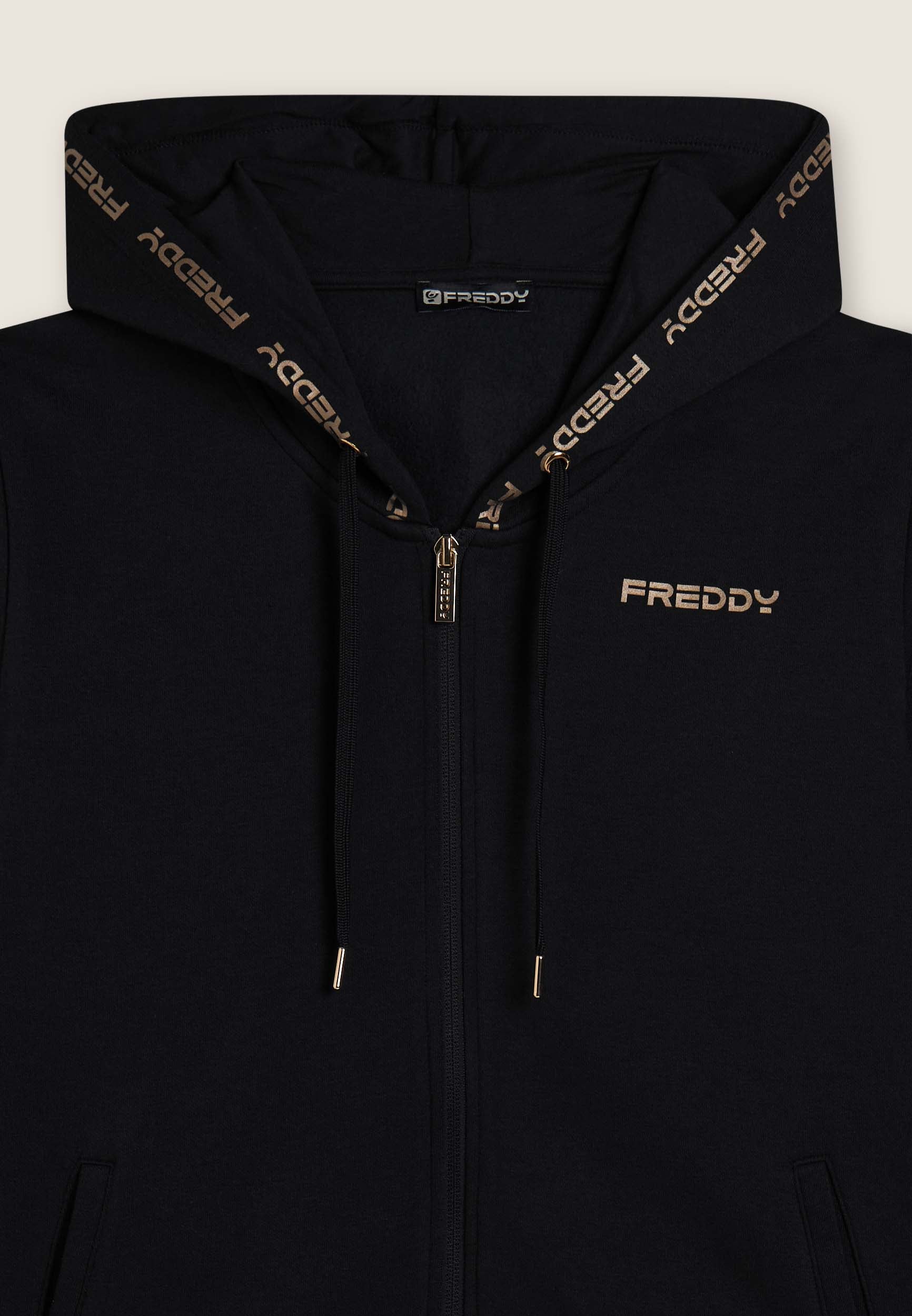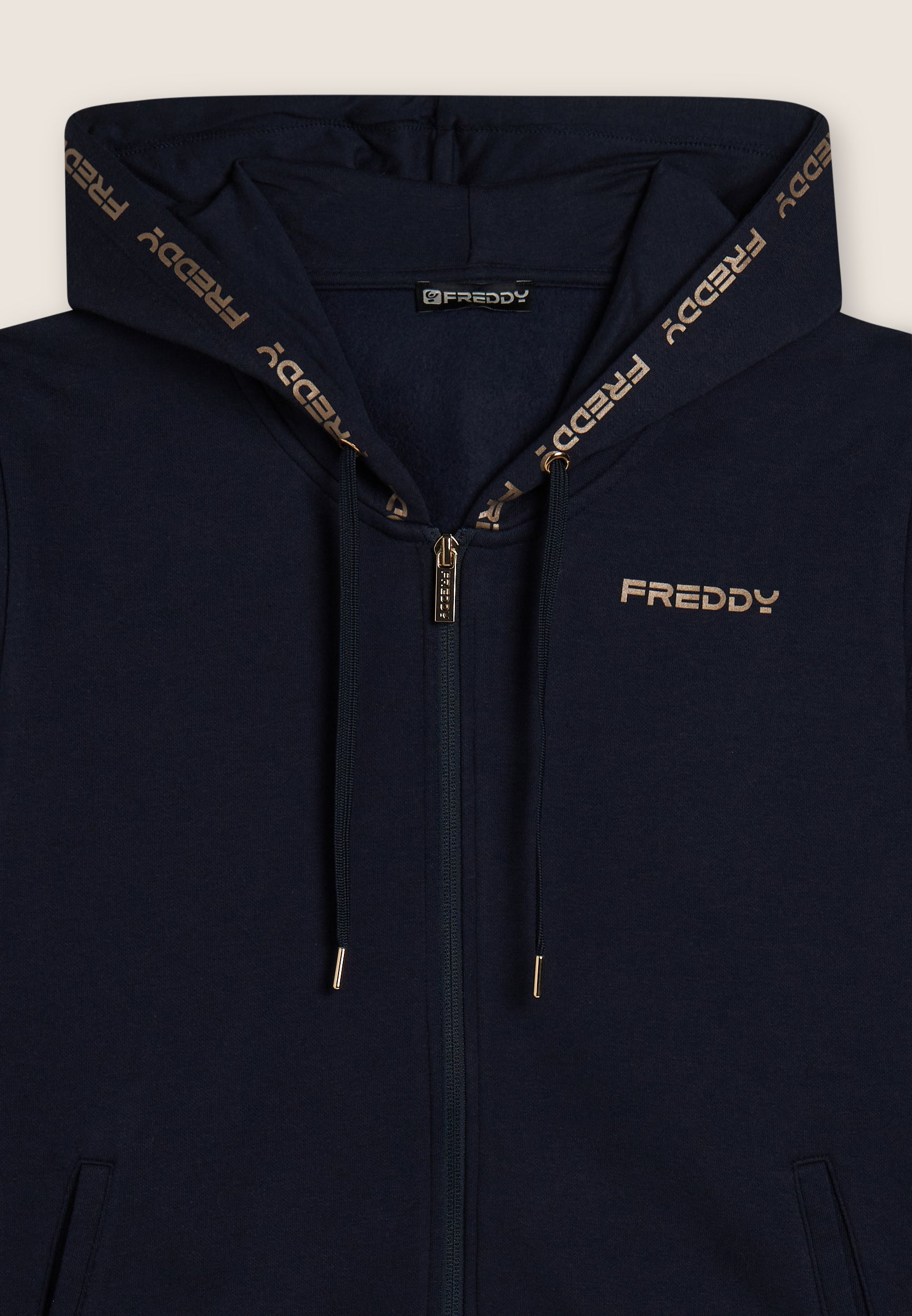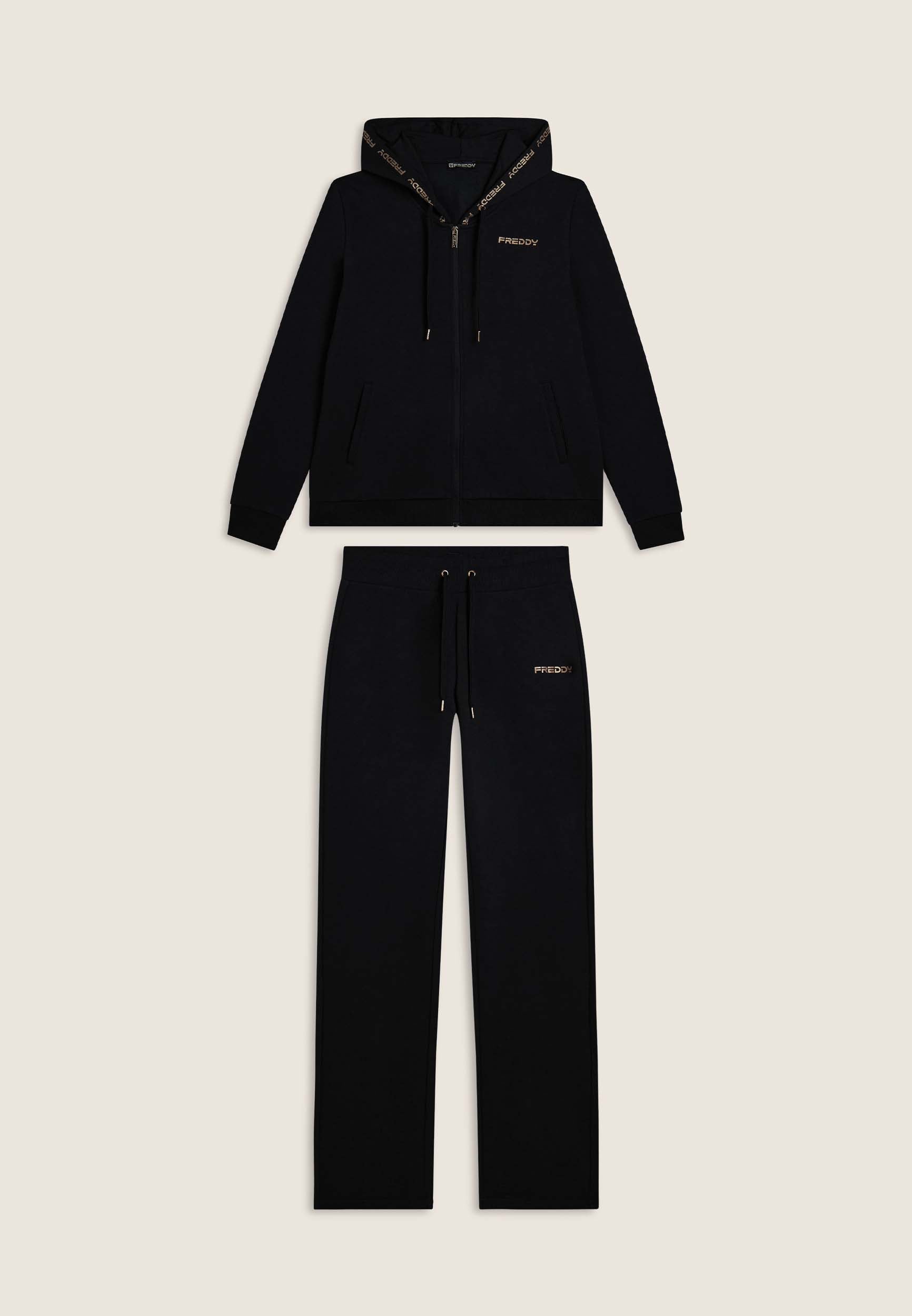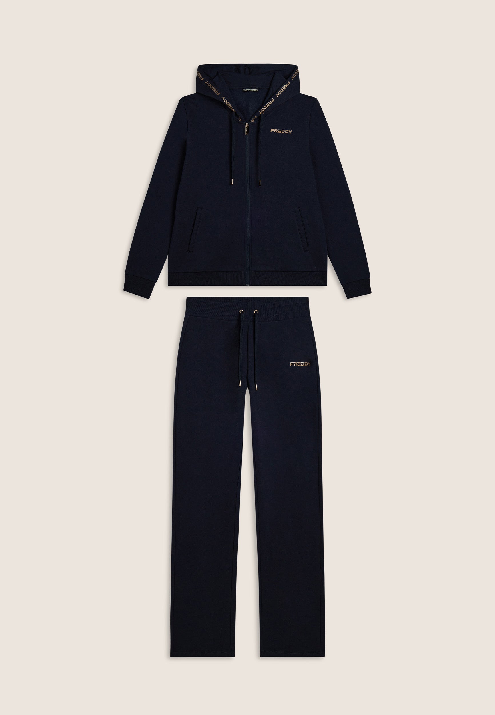 Realizzata in felpa garzata elasticizzata, questa tuta ha un look sportivo e luminoso. La felpa con zip e fascia in costina è completata da un cappuccio regolabile con coulisse, foderato in morbido jersey. Le maniche lunghe hanno polsini in costina per una migliore aderenza. I pantaloni presentano gamba dritta, vita in costina con coulisse e una vestibilità comoda. Il logo Freddy color oro decora con eleganza il bordo del cappuccio, il cuore e il fianco sinistro dei pantaloni. La felpa è dotata di tasche interne pratiche e discrete.
