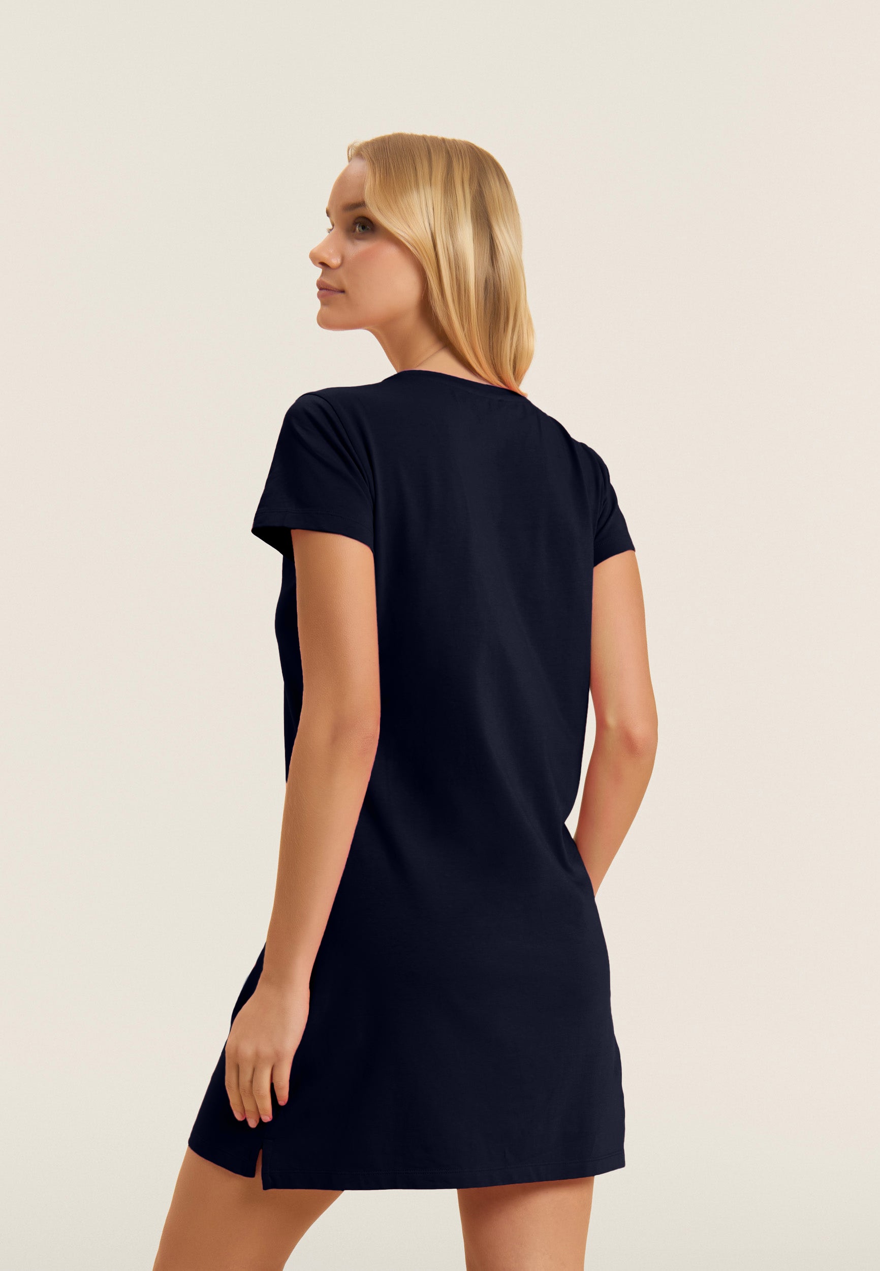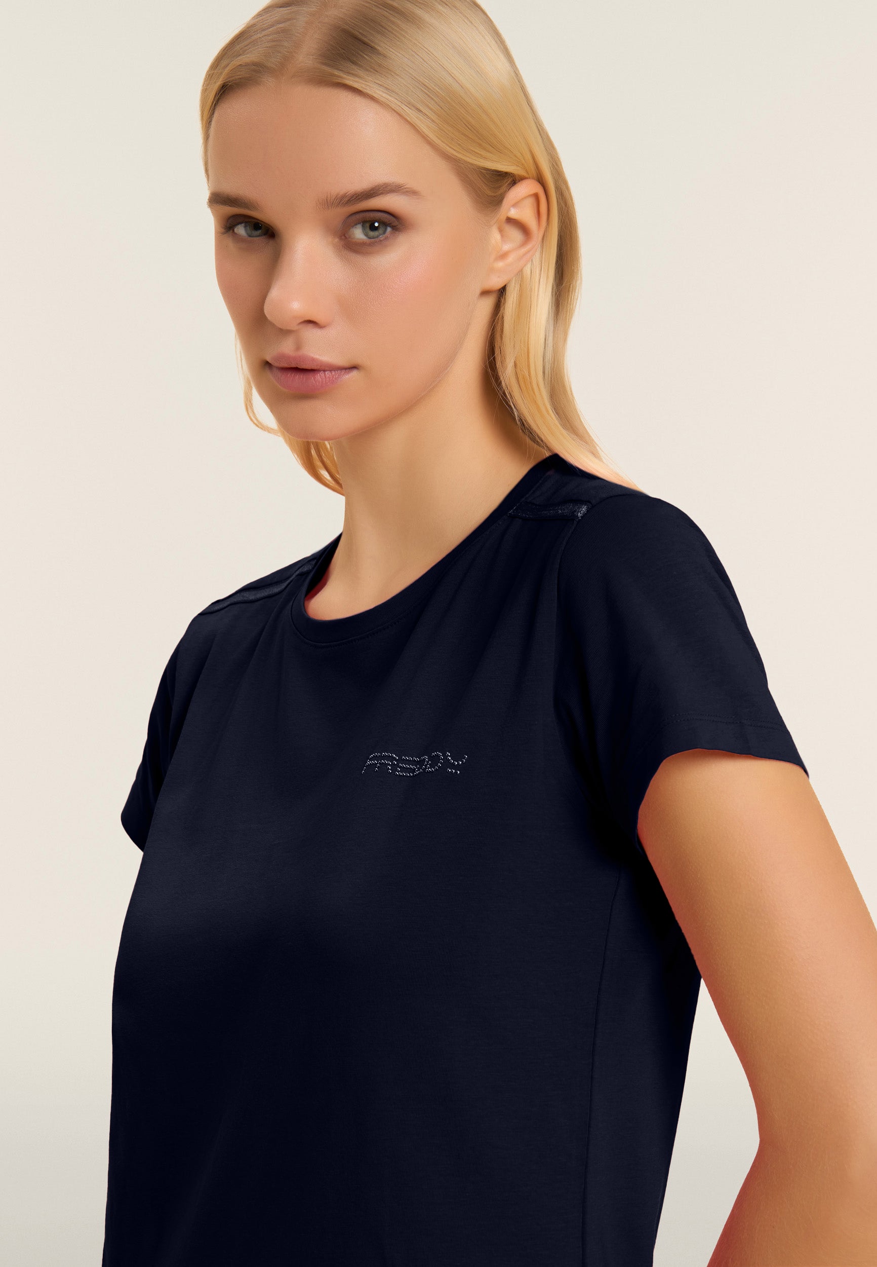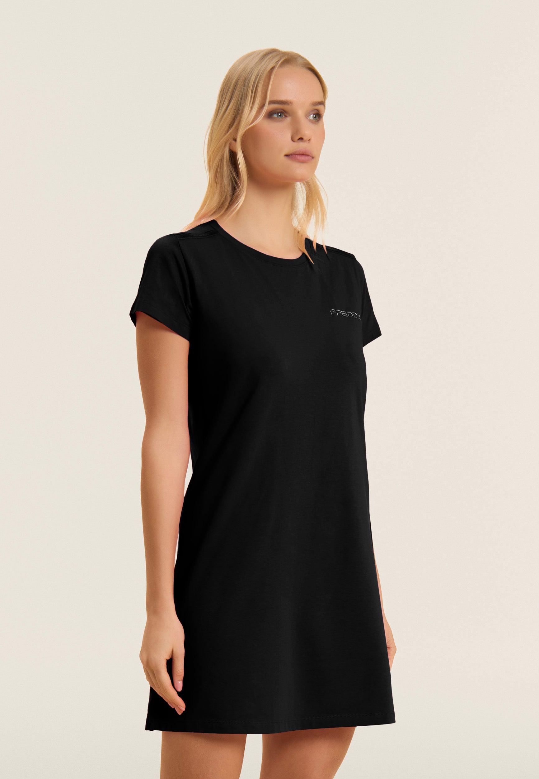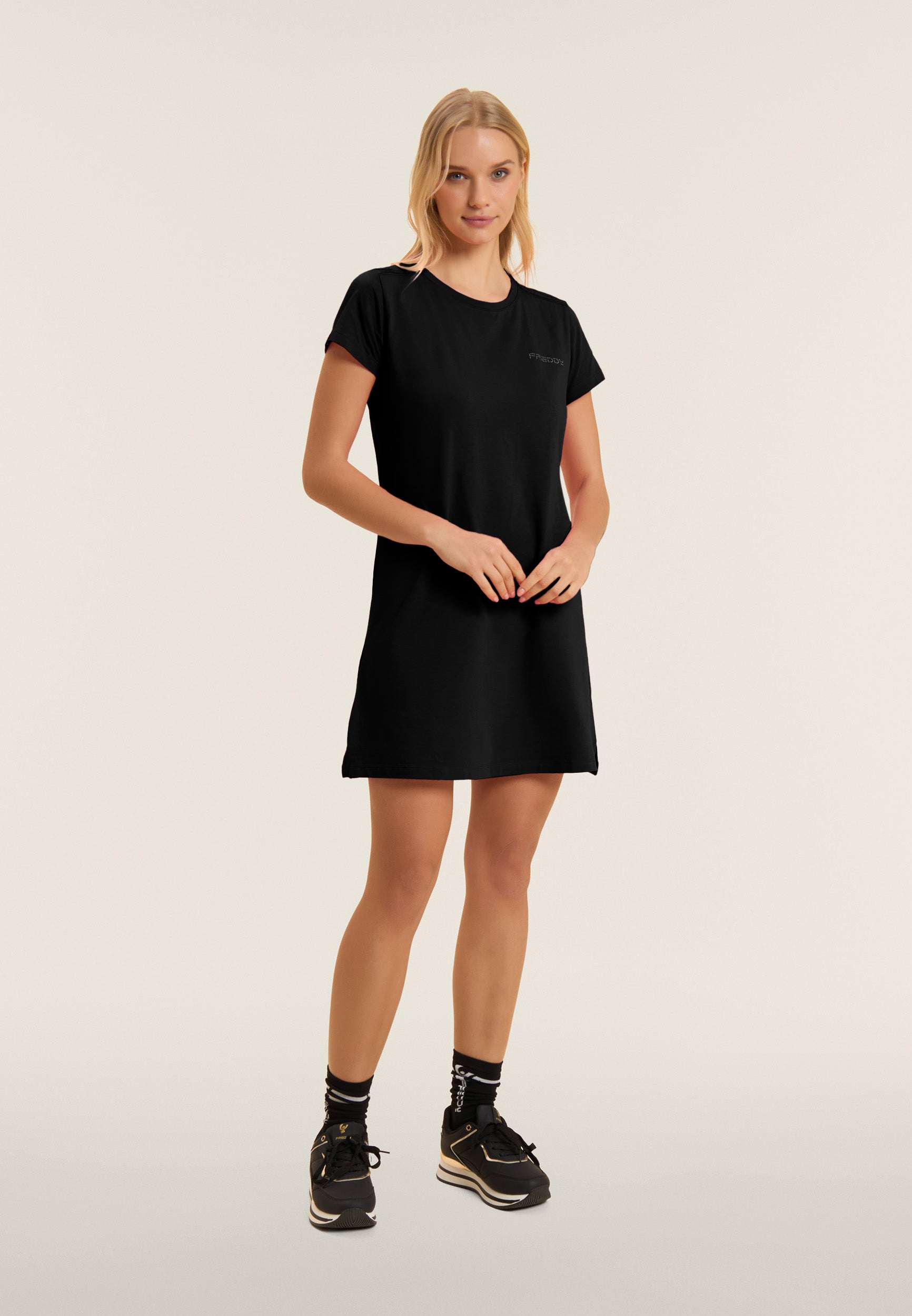 Vestito dritto, con vestibilità regular e lunghezza media, ideale per un look casual e confortevole. Il fondo dritto con piccoli spacchi laterali e lo scollo girocollo ne esaltano il design semplice ed elegante. Le maniche corte e il logo FREDDY in perline rosa chiaro sul cuore completano il look. Realizzato in jersey leggero stretch di cotone, è perfetto per il tempo libero.